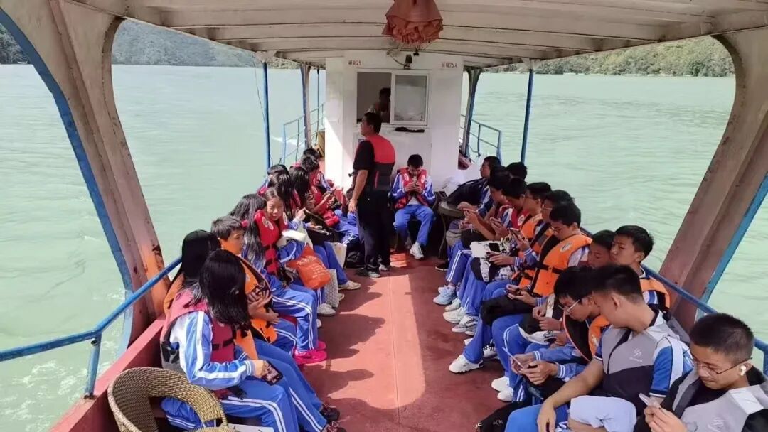 在湍急的江面上,一艘艘小船载着孩子们缓缓前行。昔宜、嘎止村村辅警和安全员全程随行,站在船头瞭望水情,时刻警惕暗流与漂浮物。船舱里,一位女学生眼眶微红,望着身旁的村辅警,声音轻柔却真挚:“这段上学路,因为有你们在身边,我们才有安全感。”