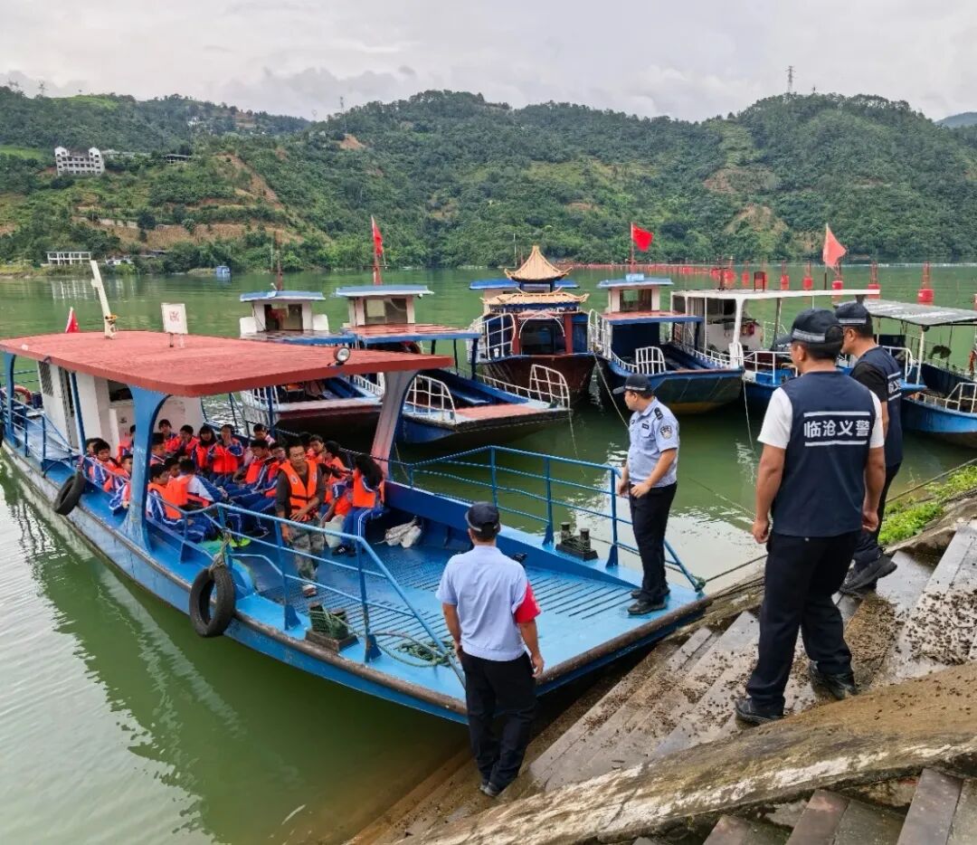 码头边,没有喧闹的口号,只有细致的准备。村辅警和义警弯腰围着船只,手指划过船身接缝处,确认每一处都牢固;转身又拿起救生衣,帮助学生穿好。
