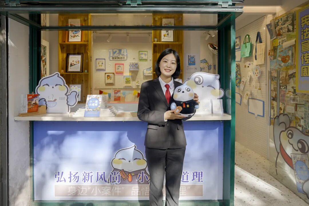 12月4日是国家宪法日,在兼具历史底蕴与时尚气息的愚园路法治文化街区,上海市高级人民法院和上海市长宁区人民法院(以下简称长宁区人民法院)开设了一家独一无二的法治宣传快闪店,店里整齐摆放了法治书籍、普法案例、法袍、法槌和法治文创产品,一场别开生面的“沪小法带你e起学法”普法活动火热开启。长宁区人民法院未成年人与家事案件综合审判庭副庭长徐莉化身法治宣传快闪店“一日主理人”,带领线上线下的观众沉浸式感受法治文化与城市街区的深度融合。