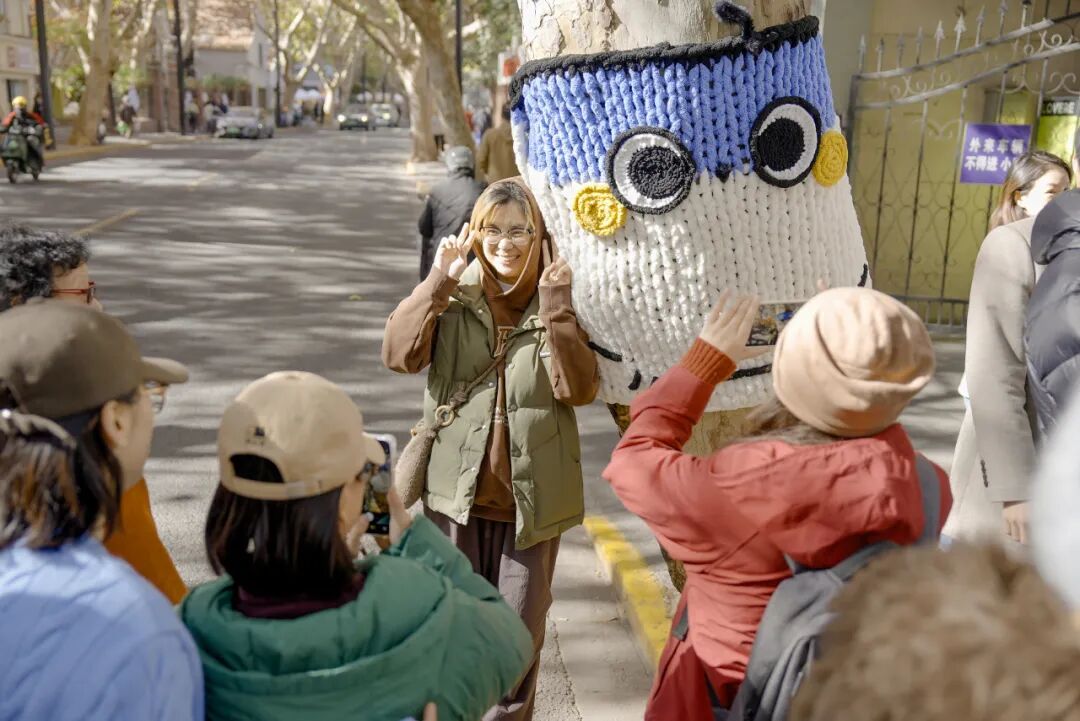 快闪店门口,身披沪小法形象“毛衣”的大树格外吸睛。沪小法的设计灵感源于上海高院大楼的雏鸟造型和《山海经》中的传信神鸟,其昵称“青团”更是自带上海本地特色,它就像法治文化的传播使者,在街区里扎根,将公平正义的“佳音”传递到群众心中。