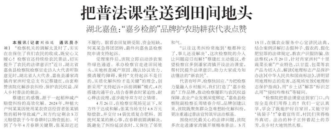 代表有呼声,检察快回应。“为把检察力量融入乡村振兴,我们打造了‘嘉乡检韵’工作品牌,推动检察履职与农民权益保障、农业产业发展深度绑定。”嘉鱼县检察院副检察长周绪春介绍,品牌创建以来,该院既聚焦群众急难愁盼化解纠纷,更注重通过普法宣传筑牢法治根基。