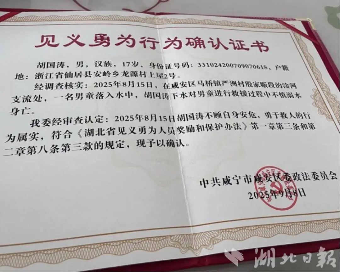 “这份恩情,我们全家一辈子都不会忘记,会教孩子永远记得这位英雄哥哥。”事发当日,被救男童家属专程向胡国涛亲属送上锦旗和手写感谢信。锦旗上,“舍己救人 英勇无畏”八个大字格外醒目。