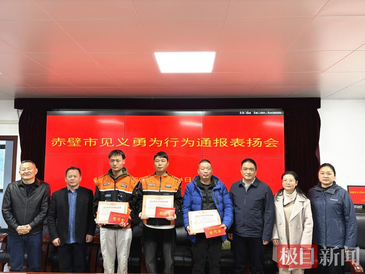 12月4日,赤壁市2025年第5场确认见义勇为行为通报表扬会在市委政法委召开,赤壁市委常委、市委政法委书记王辉将见义勇为行为确认证书郑重交到张继光、龚胜、王宇江手中。