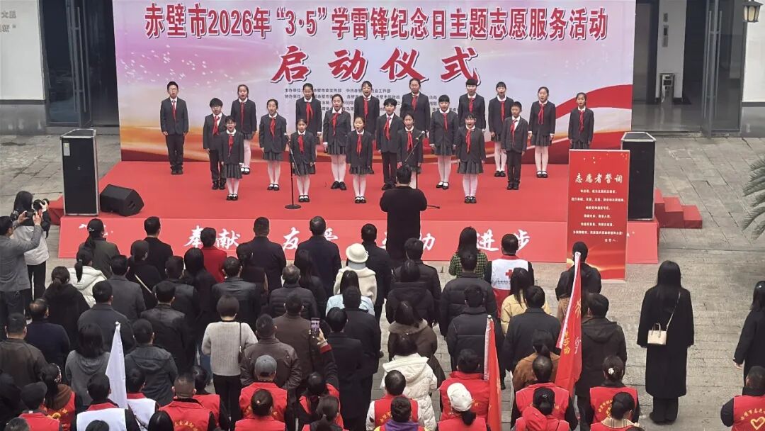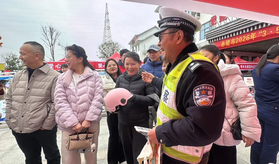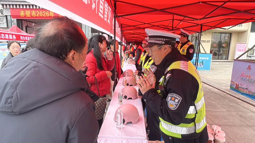 3月5日,赤壁市2026年“3·5”学雷锋纪念日主题志愿服务活动启动仪式在创新聚集区隆重举行。赤壁市公安局交通管理大队以此为契机,在活动现场“摆摊设点”,开展了一场别开生面的交通安全主题宣传活动,将交通安全知识送到群众身边,以实际行动弘扬雷锋精神。